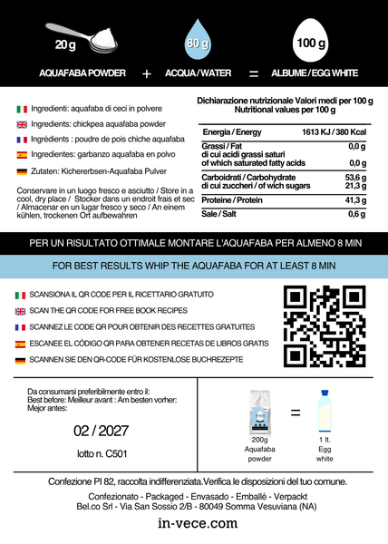 Con 20g di aquafaba + 80g di acqua ottieni 100g di prodotto pronto all’uso, con la stessa resa e funzionalità dell’albume.